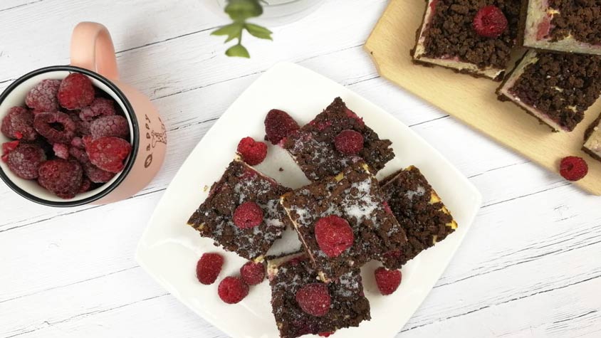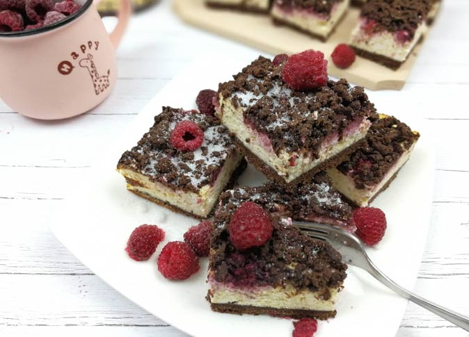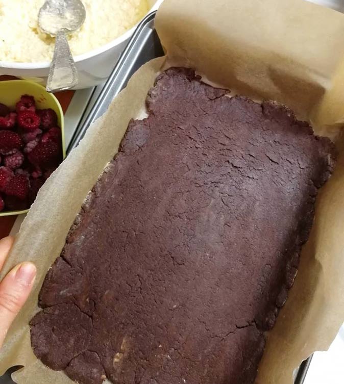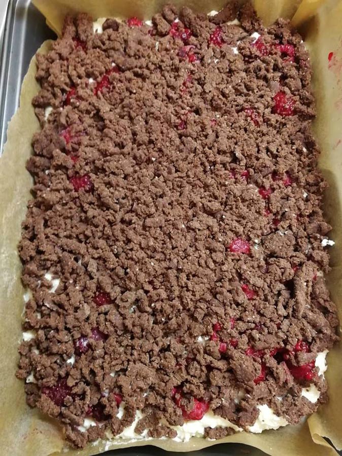 Kend a krémet az elősütött lapra és szórd meg bátran málnával. Én alig tettem rá - ez hibapont, mert sütés után a sok is kevésnek fog tűnni. Szóval ne sajnáld.